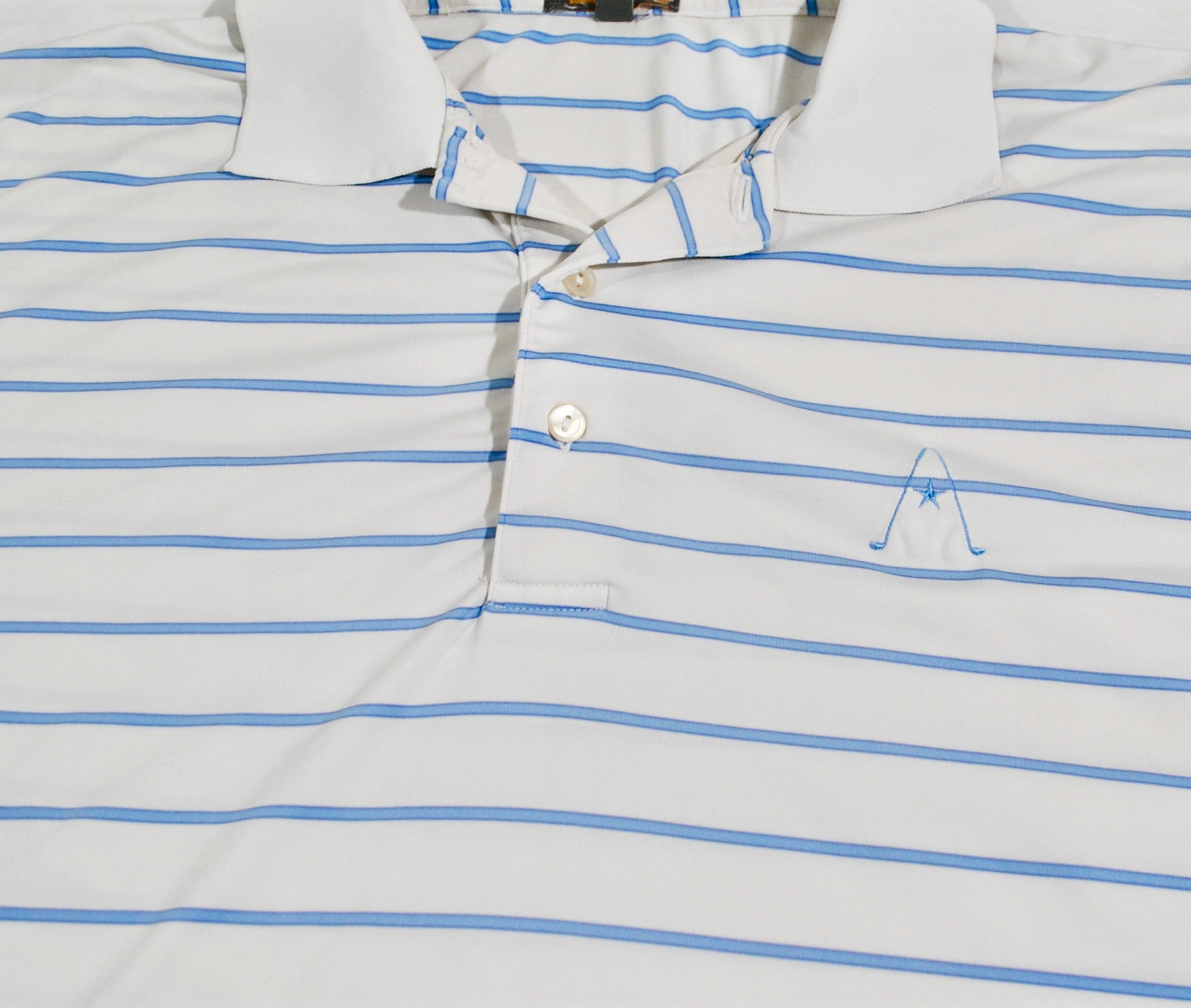 You are looking at a Austin Golf Club Peter Millar Polo Size X-Large. The shirt is old school and does have some wear as seen in the pictures. The shirt is still in decent condition. Measurements: pit to pit 25", back collar to bottom 32.5".