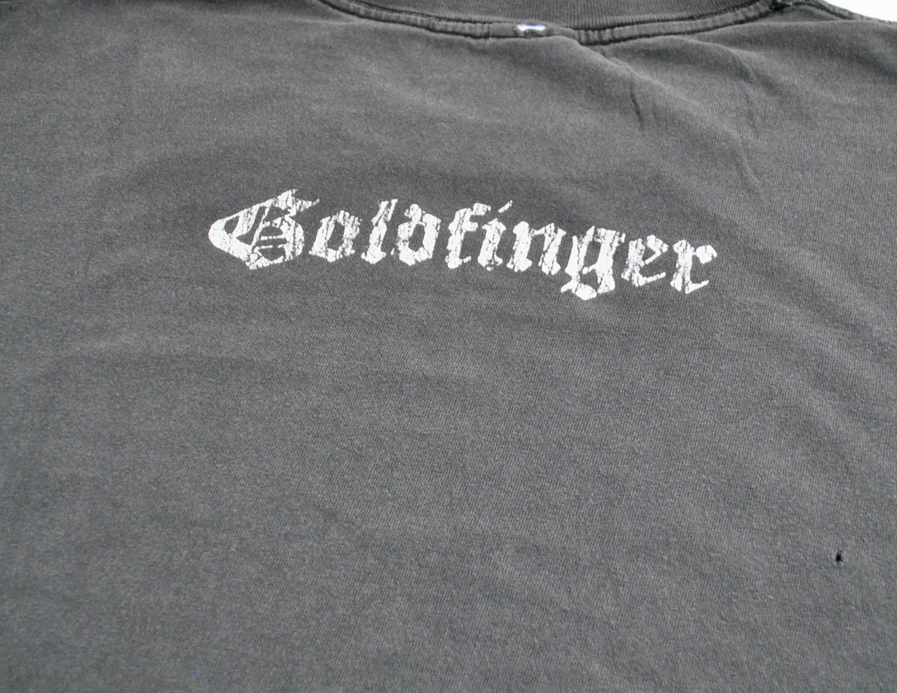You are looking at a Vintage Goldfinger Shirt Size Large. The shirt is old school and does have some wear as seen in the pictures. The shirt is still in decent condition.